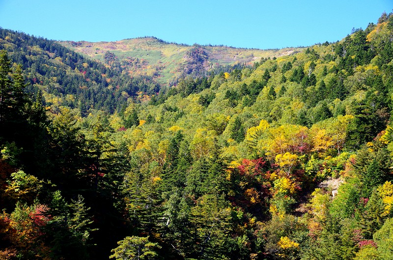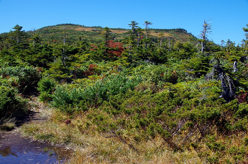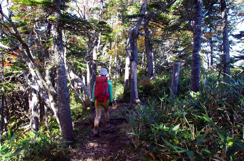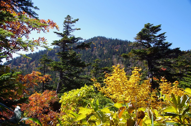 前回来た時はこの周辺がタケカンバの黄葉が見事であったが、今回は灌木の紅葉が始まったばかりである。