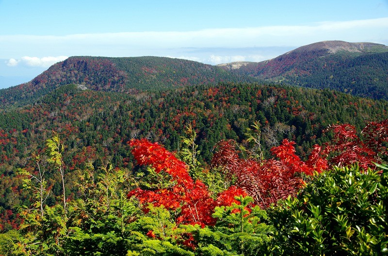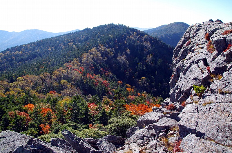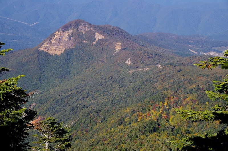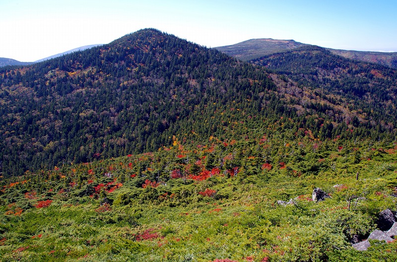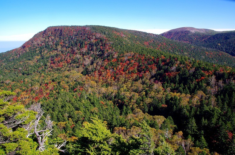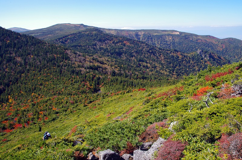 5年前に登ったときは黄葉が見事であったが、今回は稜線付近が見ごろで、まだ山腹まで紅葉前線は降りていない。