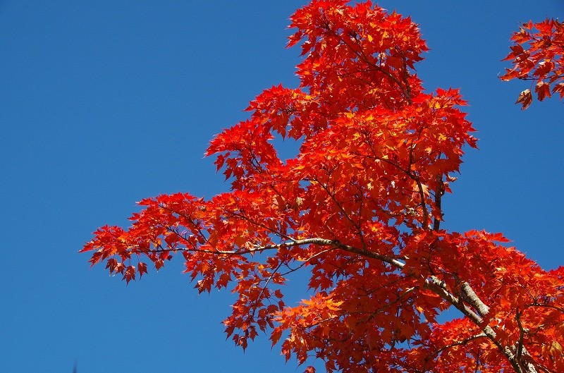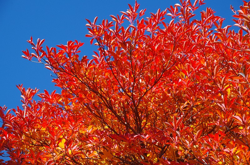 サラサドウダンの紅葉が青空の下に輝く。