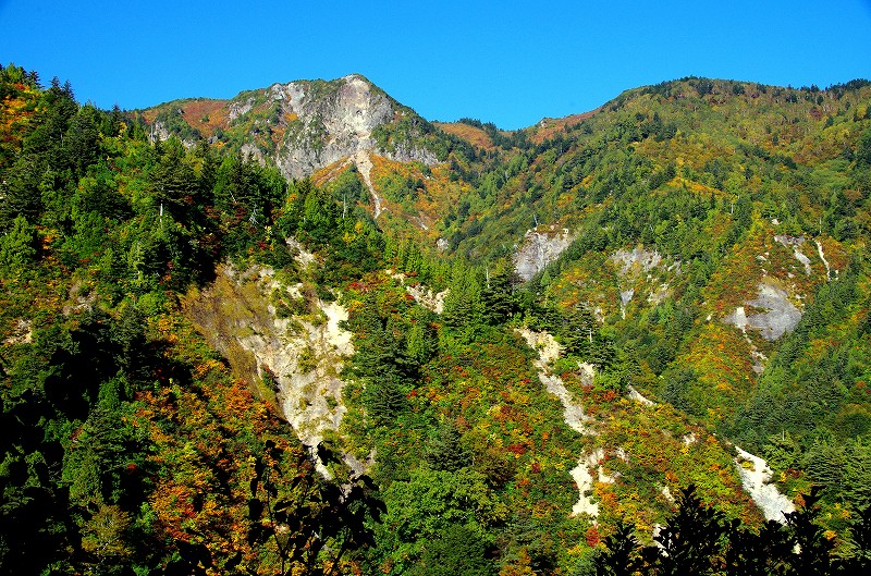 大滝川左岸に連なる山々は岩壁も露わで、穏やかな吾妻連峰のイメージとは異なった風景が広がる。