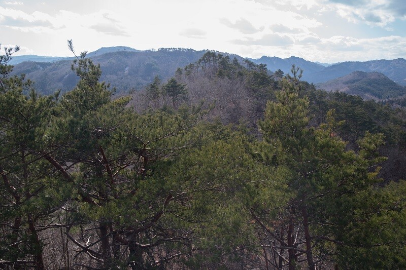 南西には岩岳(左奥)、近辺山(標高408m・三等三角点・右奥)と、大高松巨石群のある高松山(中央手前少し左の台形の山)、そして懸田御前の長女おえんが殺害されたと言われるおえん平(右手の茶色く見える平坦な場所)が一望できた。