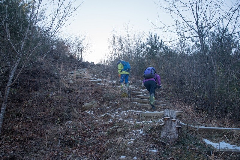 じめじめした湿地状のところを過ぎると陽の当たらない急な階段の登りになる。
