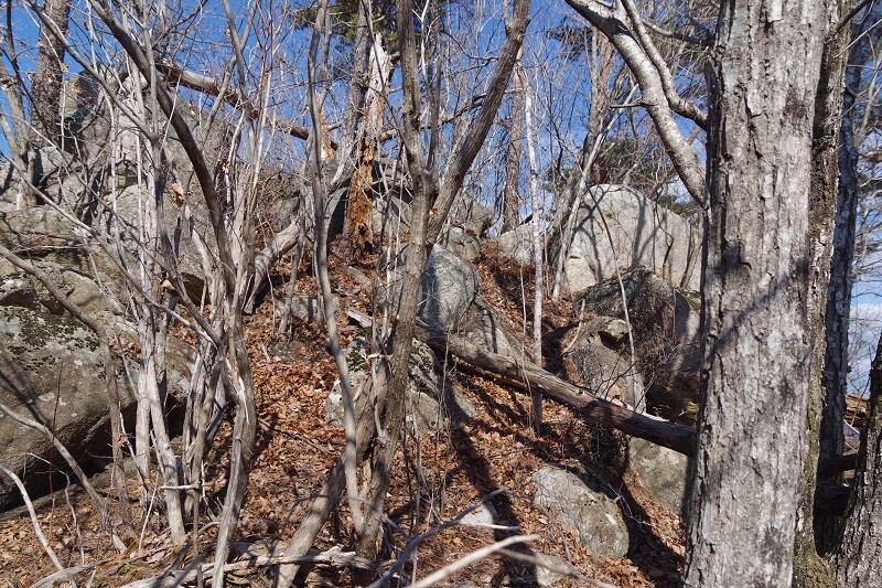 このピーク一帯は大規模な伐採が過去に行われたようで、低木が密生し、しかも巨石が積み重なっているため先に進むのが大変になる。