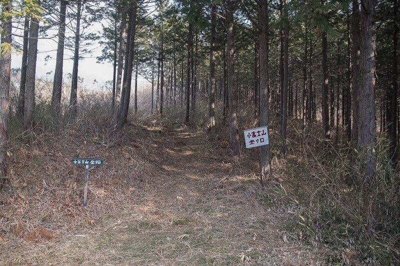 林道に出て少し東側へ登ると小富士山の登山口標識がある。