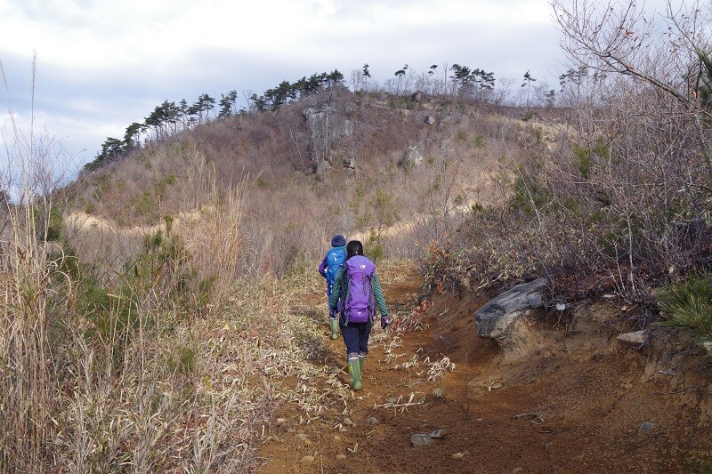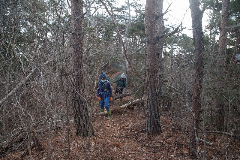 三峰が近づくと踏み跡は消え、尾根が細くなり、アカマツの倒木がルートの邪魔をする。