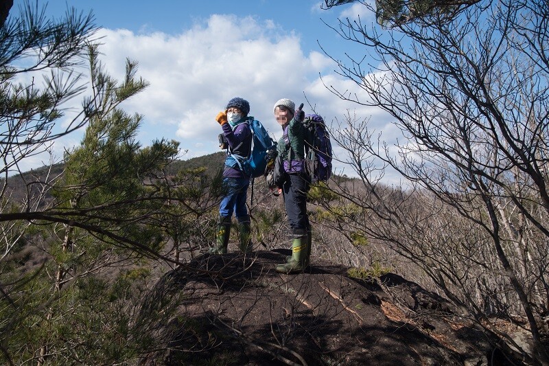 二峰の鞍部で風を避けてお昼にする。