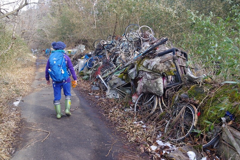 おえん平から北東に車道を下って行くと、道脇に夥しい数の粗大ごみが置かれていた。