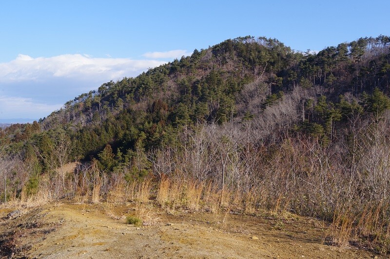 平らになった場所から北側を見ると丸森富士(羽山)が林道を隔てて至近距離に見えていた。