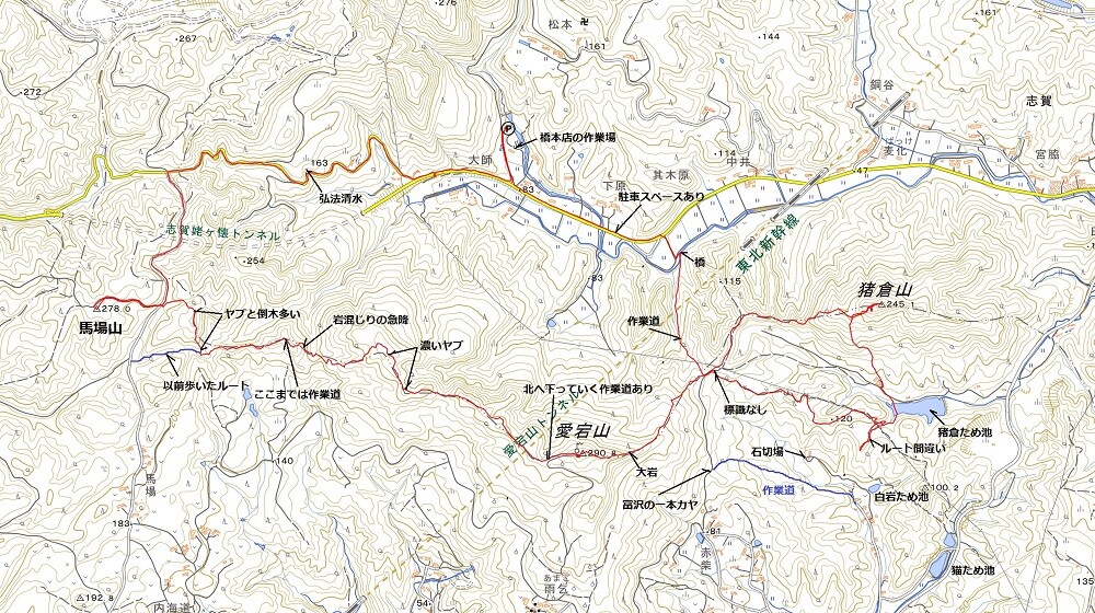 大師温泉跡~弘法清水~馬場山~愛宕山~十字路分岐~猪倉山~猪倉ため池~秋柴線82番鉄塔~十字路分岐~県道25号~大師温泉跡